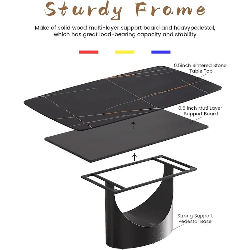 Sintered Stone TabletopThe marble dining tabletop is manufactured by rock burning with high-pressure and 1200 high-temperature, which is more durable than wooden dining table, and there is no need to worry about damage due to high temperature.Meanwhile,its Unique u-shaped carbon steel base make it more durable,which can give table great support without any shaking or sliding.661lb is not a question.