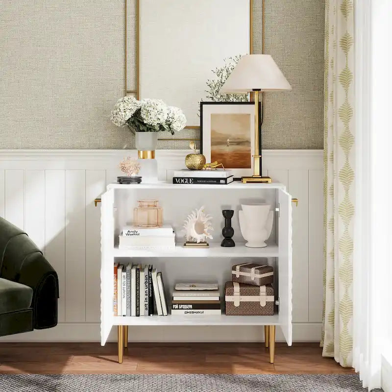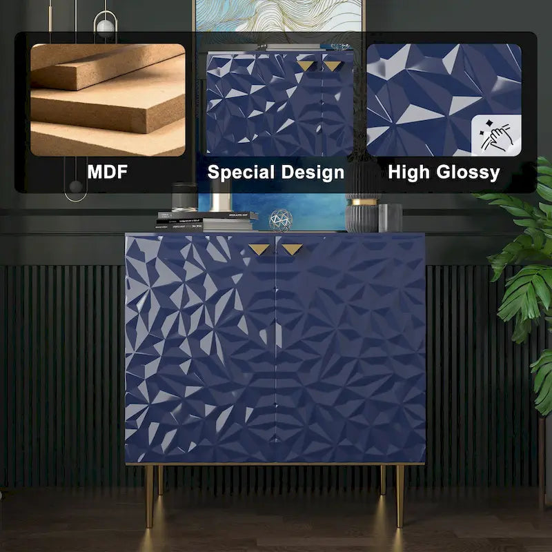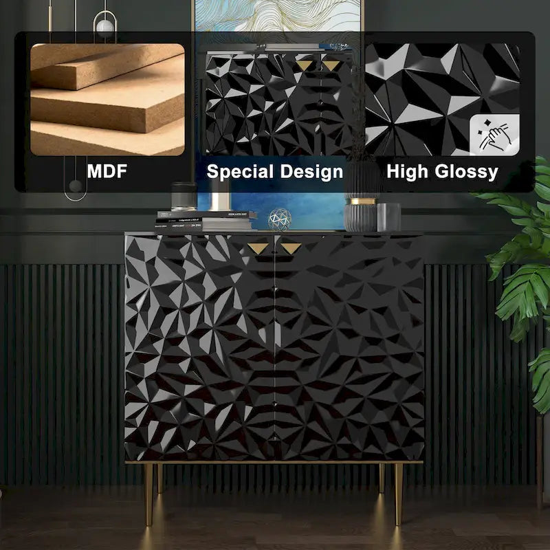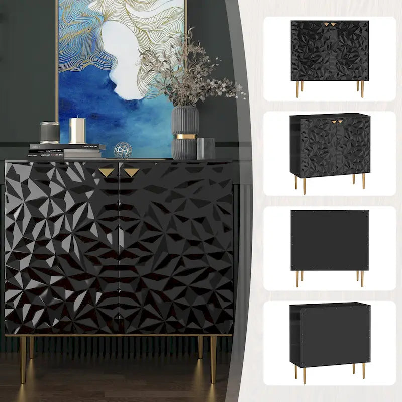 With ample storage space and a luxuriously elegant look, this accent cabinet from our store features glamorous thin gold legs and triangular handles. The two cabinet doors feature an elegant raised diamond pattern that opens to reveal an adjustable shelf for storing anything from dishes and books to shoes. In addition, the cabinet's polished back makes it look great next to a hallway wall or in the center of a home office.