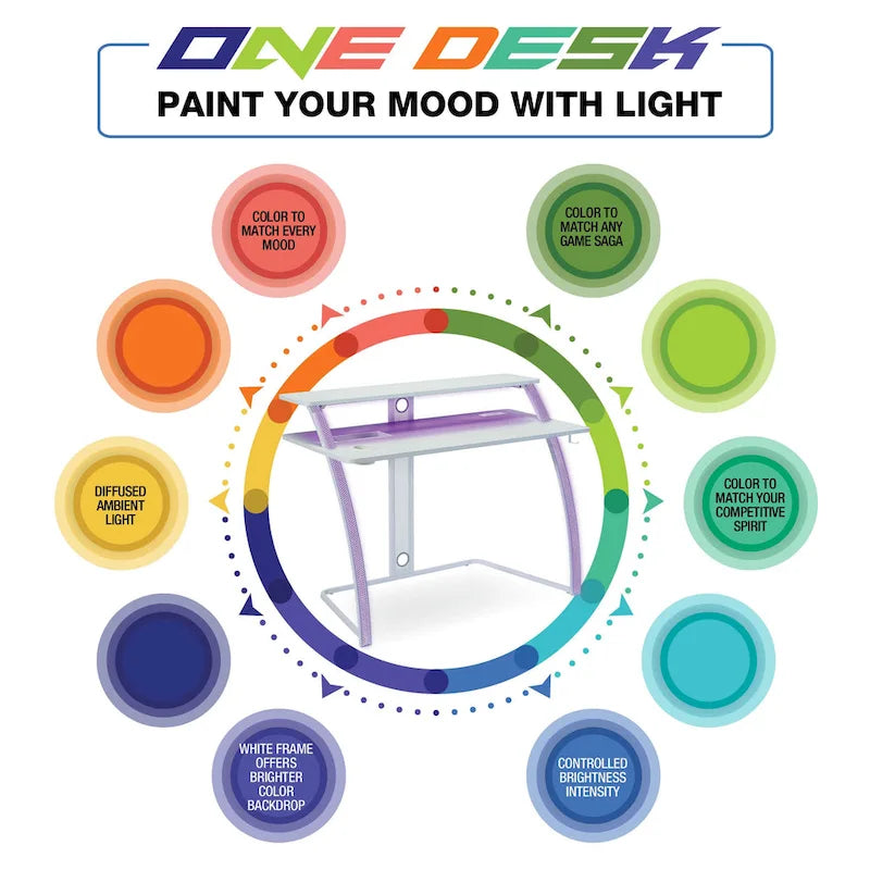 Impact your gaming experience with our 48 Gaming Desk with elevated monitor shelf, positioned for an ideal viewing height, reducing neck, shoulder, and eye fatigue. Roomy, 48 desk surface provides substantial room for all your gaming gear. Immerse yourself fully in your gaming experience with RGB LED lights mounted both under the monitor shelf, and inside the perforated steel legs, creating a compelling glow. Customize the location of your power-up preferences with 2 power outlets and dual USB power ports. Keep eyes in the game with a strategically placed device holder, and accessory tray. Integrated storage, along with our power cable management system, keeps your area distraction free, and supports a seamless transition from gaming to home office workstation. Exciting matte white, carbon fiber surface allows for fast-tracking mouse response. Sturdy steel construction frame will last for years of competitive enjoyment. Headphone hook and drink holder completes this winning choice.