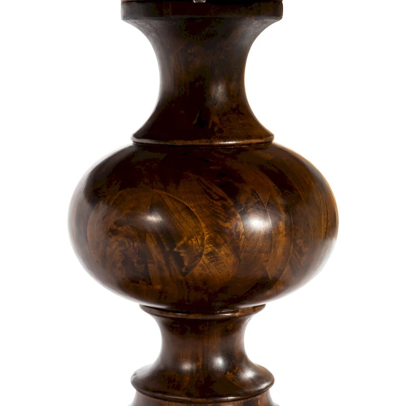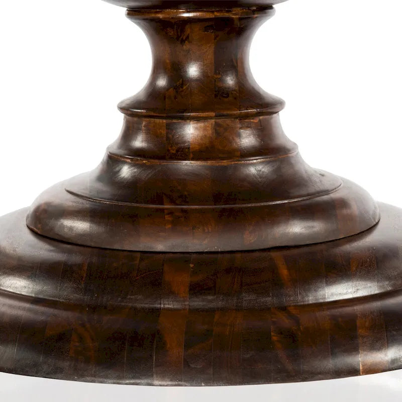 A round of classic, farmhouse elegance. Stepped base, turned mango wood pedestal, and round top are wire-brushed and finished in a dry, white wash.