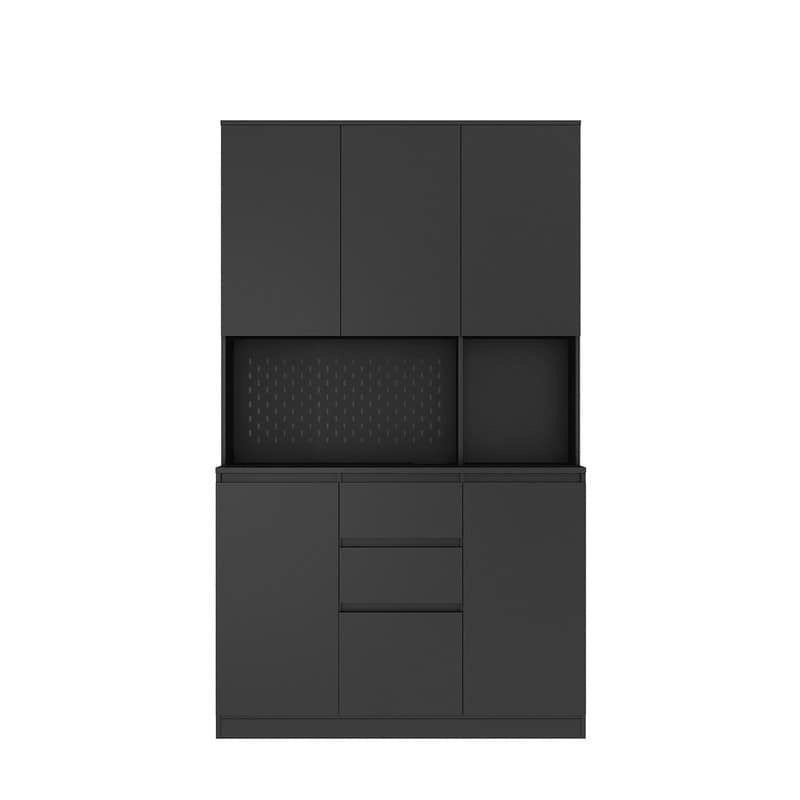 *Multiple door cupboards, a slide-out drawer for storing food or tableware, and an open grey countertop shelf for microwave oven, coffee maker, and more, provides an amazing amount of storage in this compact kitchen buffet server cabinet.