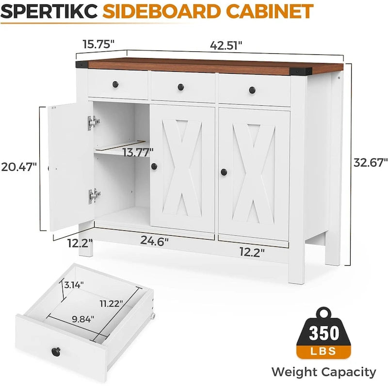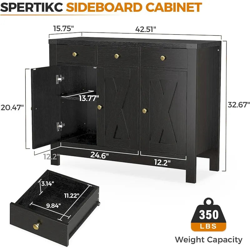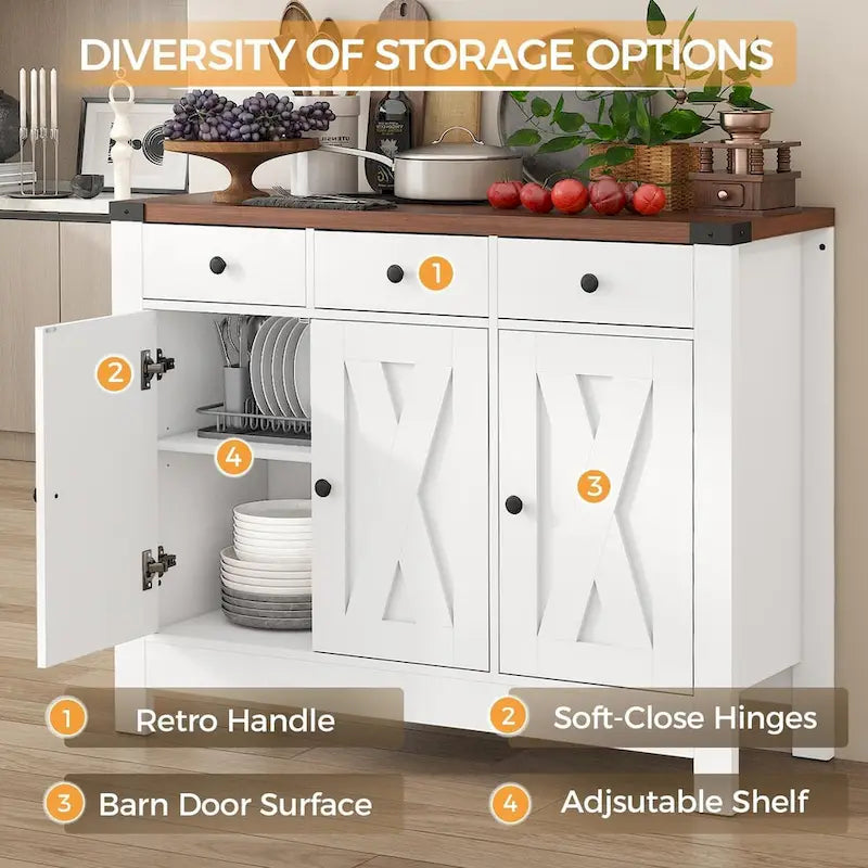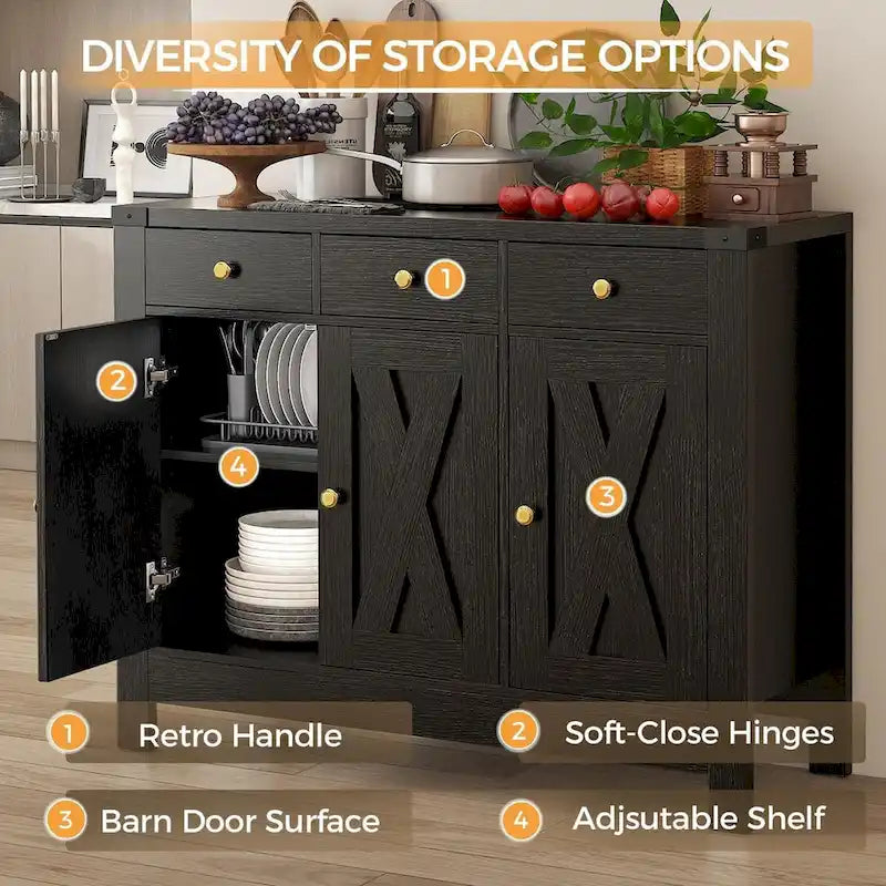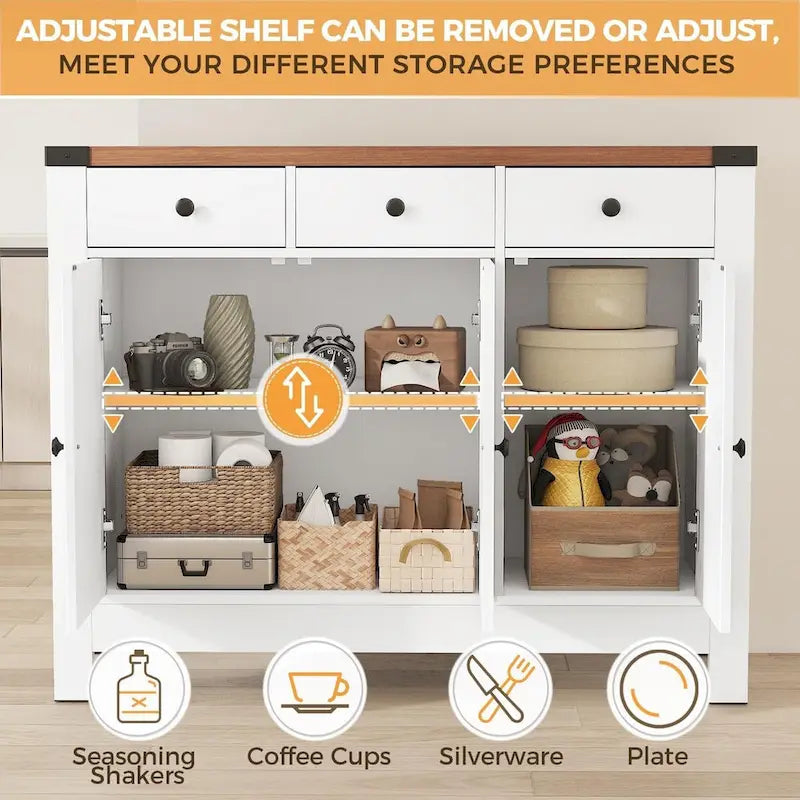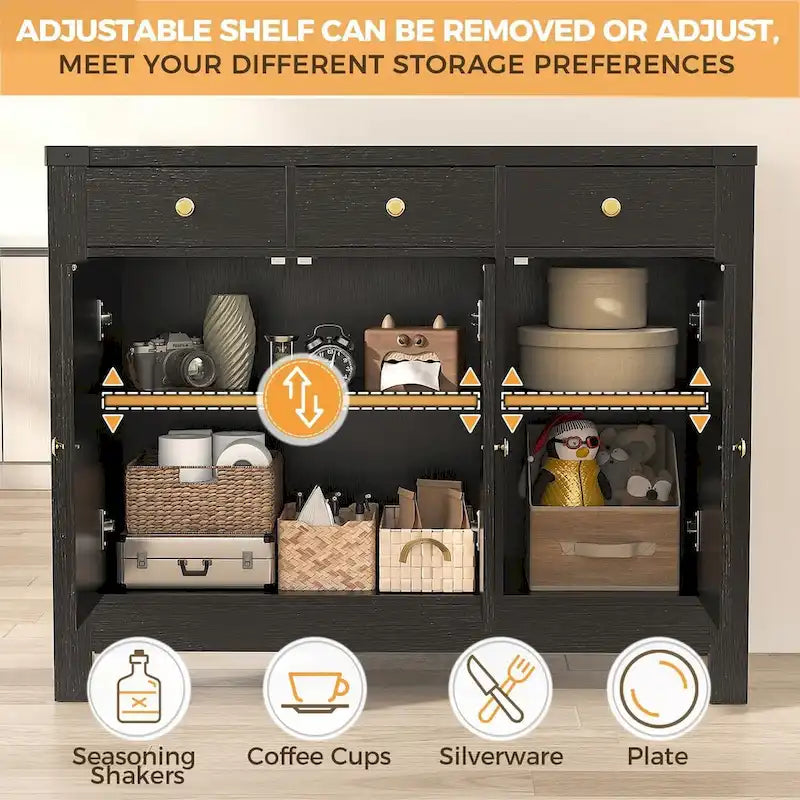 Our multifunctional sideboard cabinet is suitable for any room in your home. A perfect blend of rustic and vintage styles that can easily match most decorative themes. You can use it to use in kitchen, dining room, coffee bar, bathroom, living room and so on. The storage cabinet with doors and shelves can organize your various items, fully help you to utilize the space and make the home environment more neat and comfortable. The buffet sideboard with storage has 3 drawers and 3 doors, providing plenty of space to store a variety of items such as cookware, clothes, coffee beans, toiletries, etc. The center shelf can be adjusted up or down or removed to accommodate larger items.