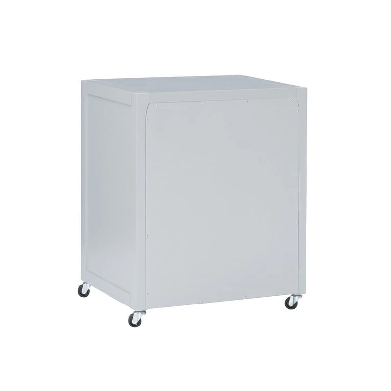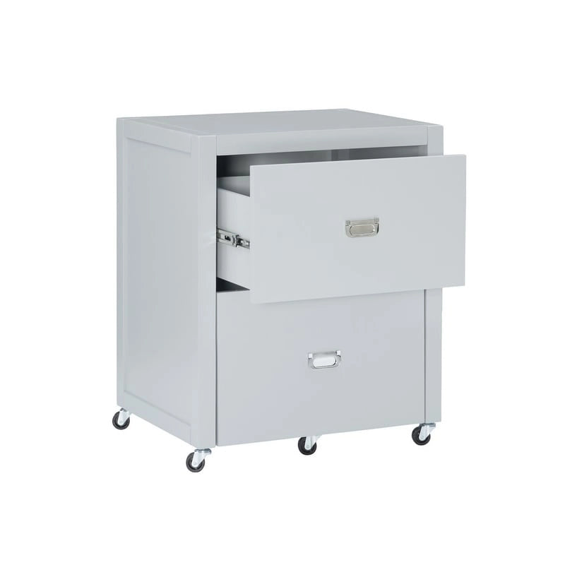 Get organized with this handy two-drawer filing cabinet. Rolling and locking casters allow for mobile storage, while metal drawer glides and shiny silver campaign style handles provide easy access to documents. Standing at 26.75 high and 22 deep, this cabinet is easy to tuck into a corner and acts as the perfect stand for a printer. The bottom drawer is designed for standard or legal-sized filing and the top is convenient for miscellaneous supplies. A sleek grey painted finish pairs well with any home decor style. Available in grey, white, and blue.