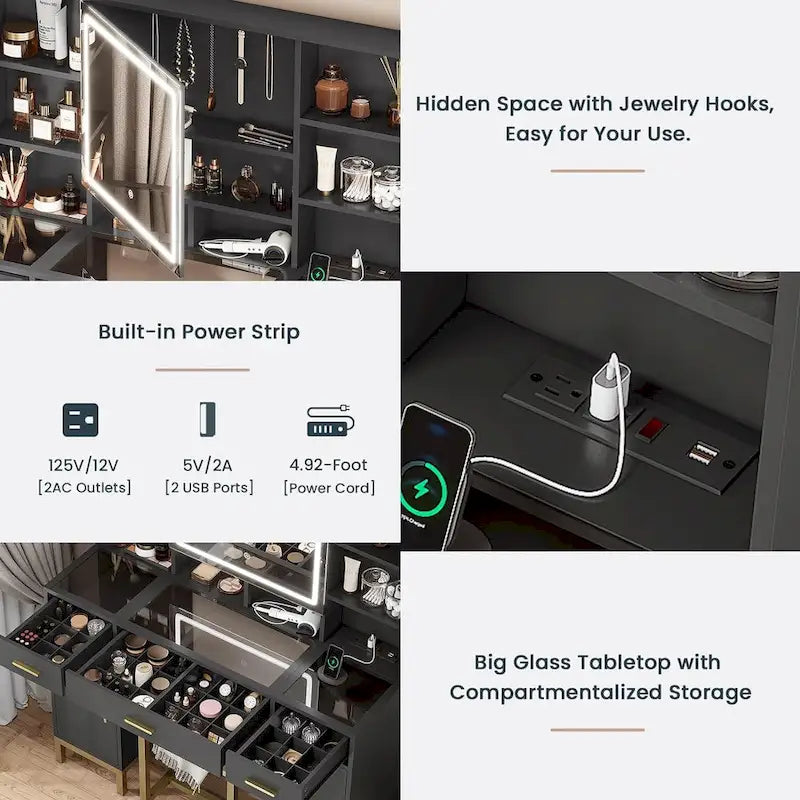 Makeup Vanity Set with Lights in 3 Colors,Vanity Desk with Mirror and Lights & Charging Station, Black Vanity Table with Big Glass Desktop, Hidden and Open Storage Shelves