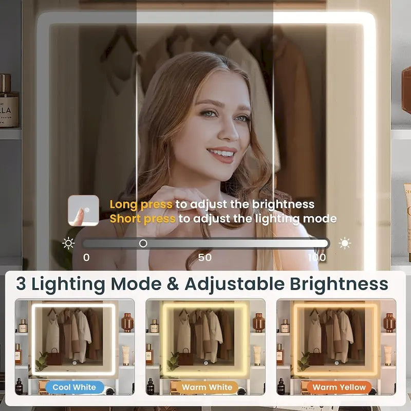 - The lights on this makeup vanity with lights are very bright and comes with 3 different settings: warm yellow, warm white and cold white light colors. Touch the switch to change the color mode, or long press the switch to adjust the brightness, perfect for home make up, salon or live broadcast.