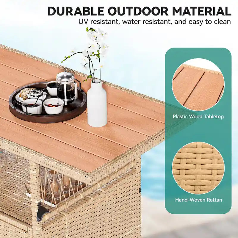 - This outdoor kitchen cabinet features a high-quality plastic wood tabletop that this patio storage cabinet can be easily wiped down anytime
