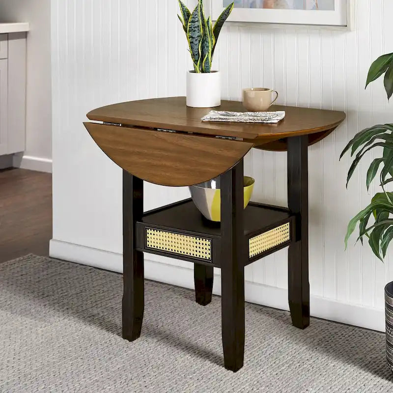 This Cane Accent Dining collection is the perfect way to add functionality and versatility to any small dining space. The beautiful Round Top Dining Table with 2-Drop Leaves features chamfered legs, and two drop leaves that can easily be folded down to save space. Crafted in a transitional style, this table is the perfect blend of classic and modern, and it also boasts an open shelf for conveniently storing items like bowls and plates or purses and backpacks. The textured inlay of cane creates an altogether unique look, adding dimension and depth to this stylish choice.