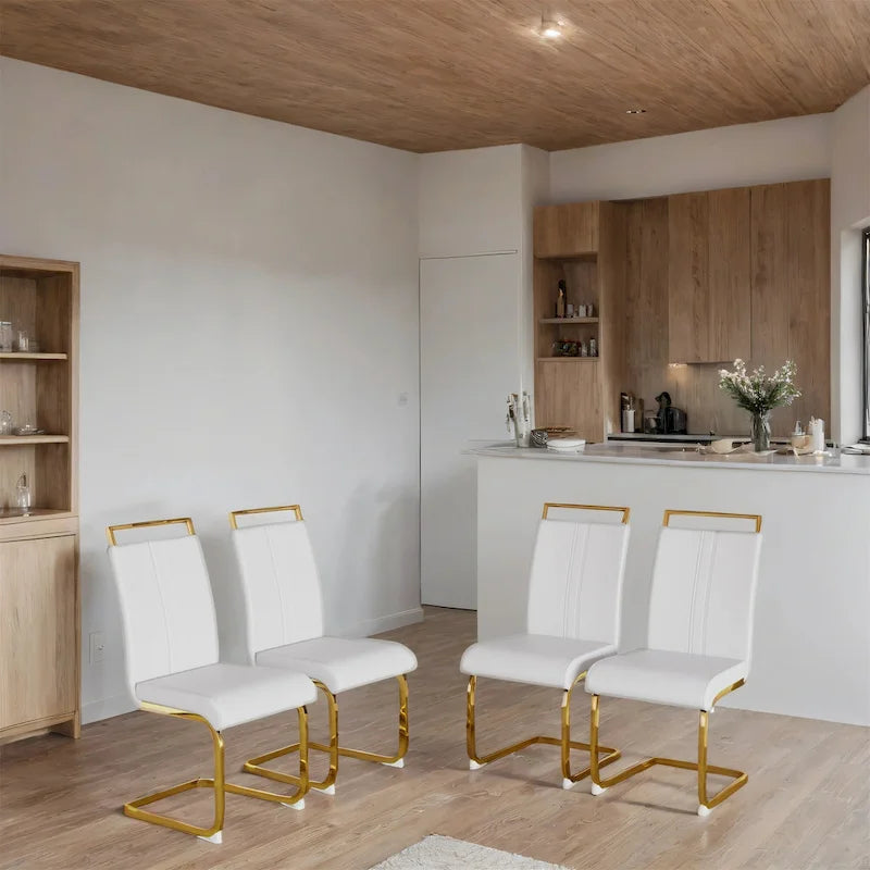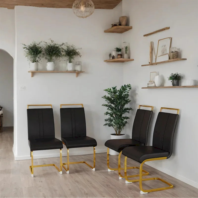 - Modern Design: A contemporary upgrade from traditional seating, these dining chairs feature sleek C-shaped gold-plated metal legs and high-back faux leather upholstery for elevated sophistication.