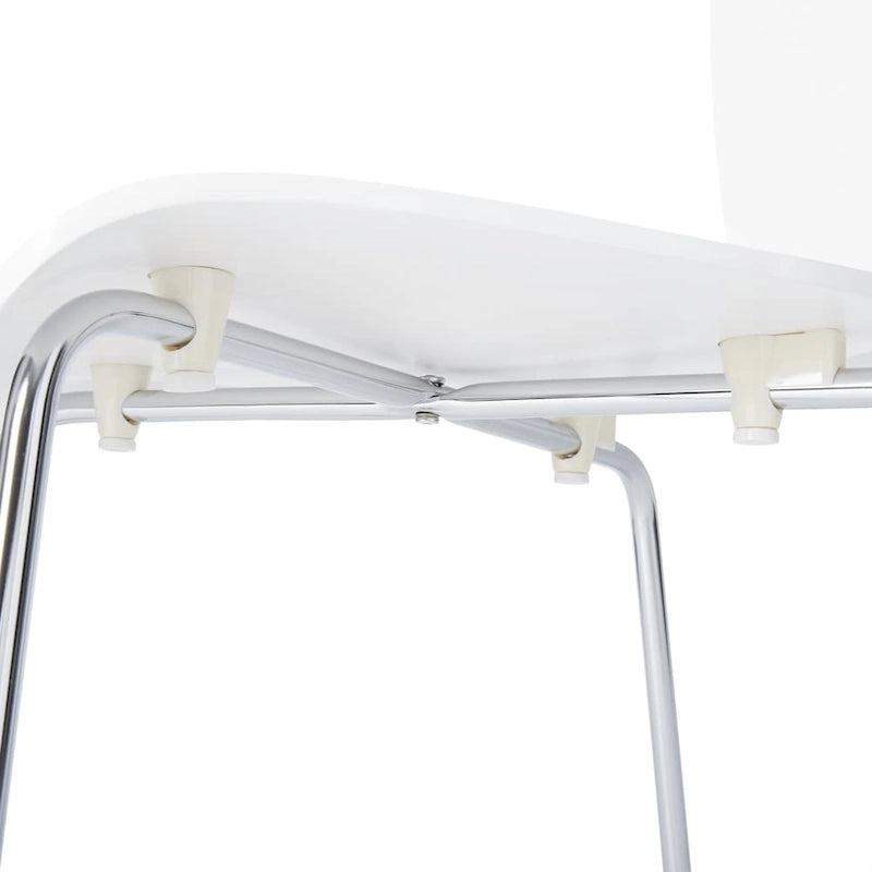 Have a little fun with your kitchen or dining room decor with the refreshing pop of color and style brought by this distinctive dining set. The white laminated table is joined by chairs in your choice of color for perfectly matching your personality. A chrome base and legs lends a glamorous touch, and the chairs can be stacked away for party time. Features: