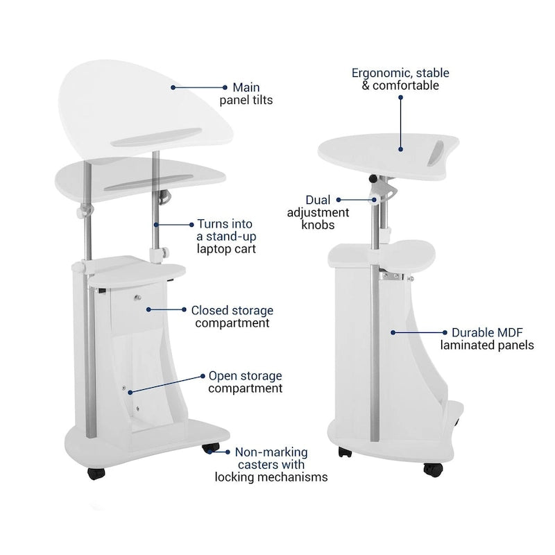 This Deluxe Sit-to-Stand Rolling Laptop Cart is the perfect solution for a versatile mobile workstation. This stand-up cart features a tilting tabletop panel with a safety edge-stopper to prevent items from sliding off, ensuring an ergonomic working angle. With an adjustable height range from 31.5 to 45.5 inches, it caters to your comfort. The cart includes both an open compartment and a closed storage cabinet, ideal for organizing essentials. The front two casters come with locking mechanisms for stability. Made of moisture-resistant MDF panels and a scratch-resistant steel frame, this cart is durable and available in black, chocolate, or white.